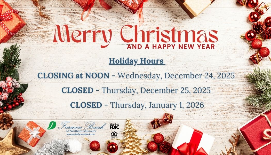 All Farmers Bank of Northern Missouri locations will be closed January 1 in observance of the New Year.